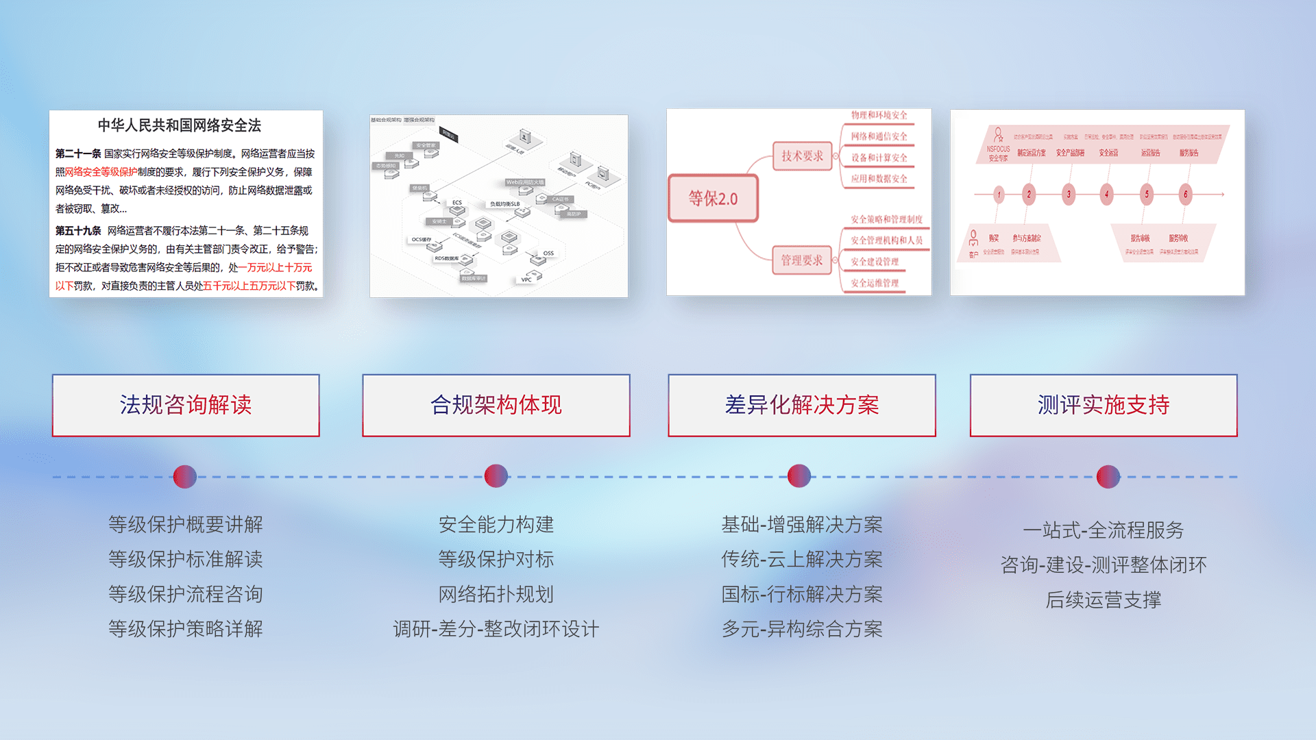通过专业的法律咨询解读、、、、合规架构体现、、差异化解决方案、、、、测试实施支持等服务,,,为客户量身打造等保合规体系。。